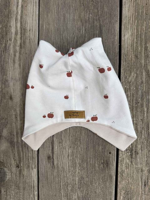 Weiße Kindermütze mit kleinen bordeauxfarbenen Äpfelchen.