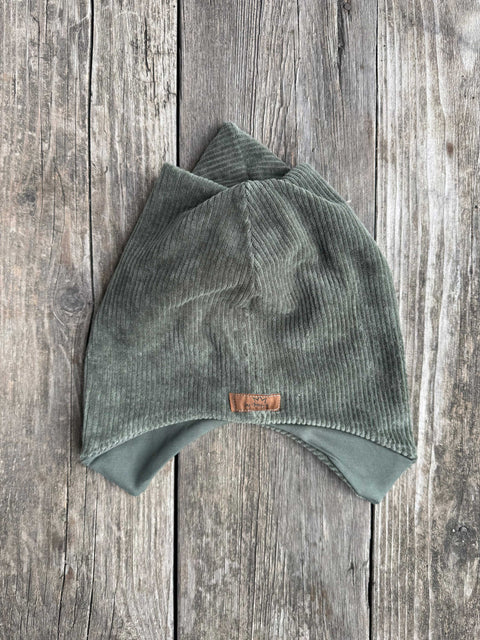 Ultraweiche Kindermütze in Cordoptik in warmem Armygrün – ein erdiger, natürlicher Grünton, der zu allem passt.