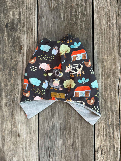 Kindermütze mit Traktor und Bauernhof auf grauem Hintergrund.