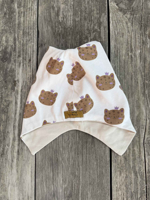 Schöne Mütze in weiß mit braunen Katzen und etwas lila.