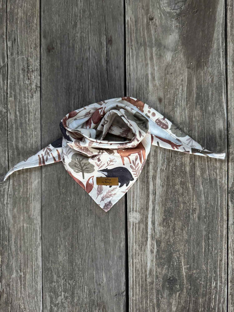 Süßes Dreieckstuch aus weichem, beigem Sweat mit fröhlichem Waldtier-Muster.