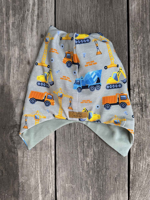 Die neue Mütze BENNO ist mit Baufahrzeugen in tollen freundlichen Farben.